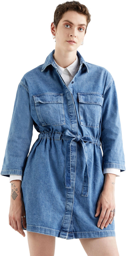 Достаточно универсальное для работы или отдыха, это платье простого и скромного силуэта. Бонус: красивый пояс на талии. Структурированное платье в стиле милитари. Вместительные накладные карманы. Регулируемые завязки для подчеркивания талии.