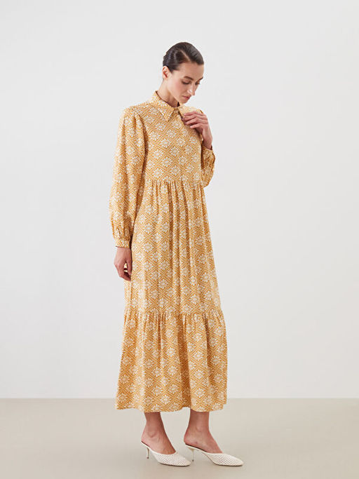 • G?mlek Yaka Desenli Balon Kollu Katkat Elbise