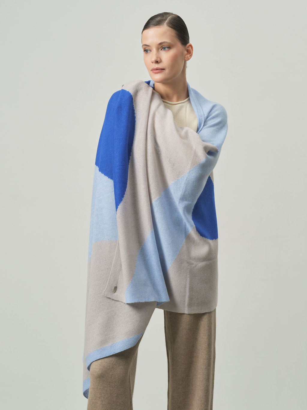 Свободный прямоугольный формат с плавно обработанными краями. Крупный абстрактный геометрический рисунок в контрастных оттенках создаёт динамичный и современный образ. Накидка красиво ложится по плечам, формируя мягкие складки и подчёркивая силуэт.