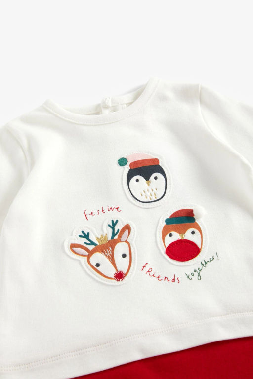 Детский нарядный комбинезон, имитирующий комплект из футболки и легинсов, выполненный из хлопка и украшенный аппликациями "Праздничные друзья". В размерах с 80 см комбинезон дополнен нескользящей подошвой на ножках.