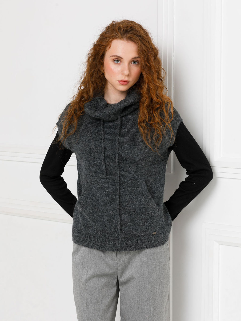 Жилет вязаный. Модель прямого силуэта, со спущенным плечом. Спереди карман кенгуру. По низу отложного воротника стойки обработана кулиса со шнурком.Торговая марка: Stilla