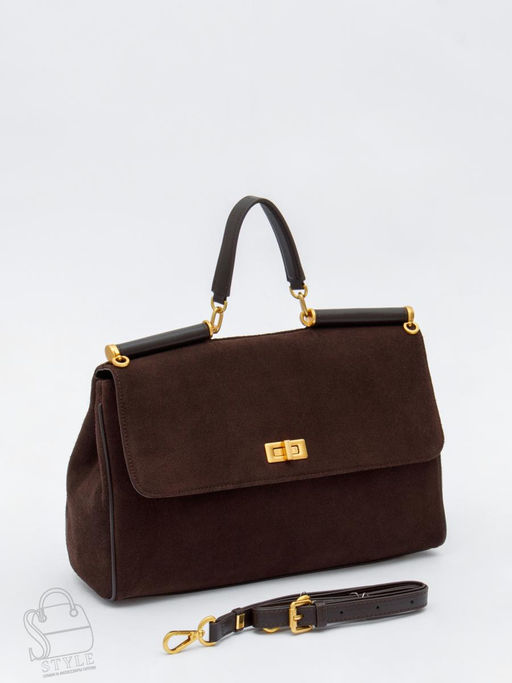 Сумка-сэтчел, выполнена из замши. Дополнена золотистой фурнитурой. Данная модель закрывается на клапан, носится в руке за встроенную ручку или на плече. В комплекте имеется ремень с регулировкой длины. Каркас полужёсткий. На дне предусмотрены ножки.