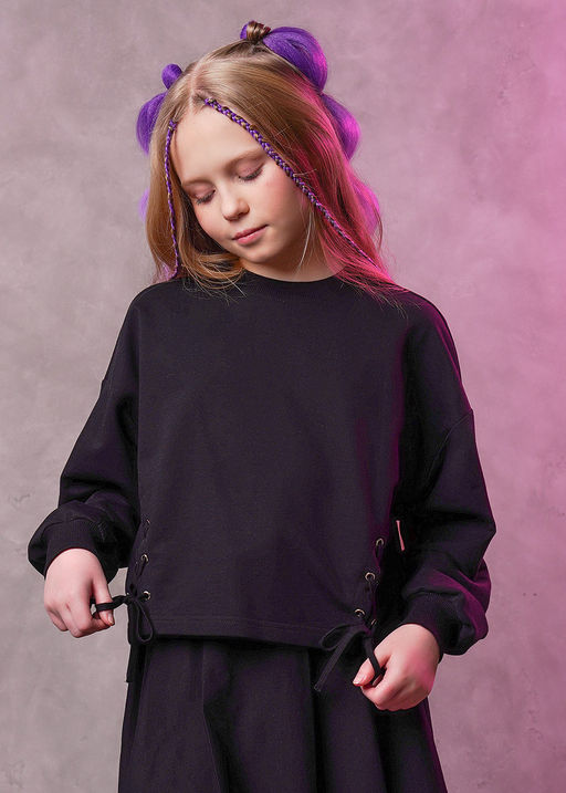 Трендовый свитшот станет модной новинкой в твоем гардеробе! Стильное дополнение - разрезы на шуровке по переду. Сочетай свитшот с брюками или юбкой из новой коллекции и создавай яркие неповторимые образы на каждый день! 100% Хлопок