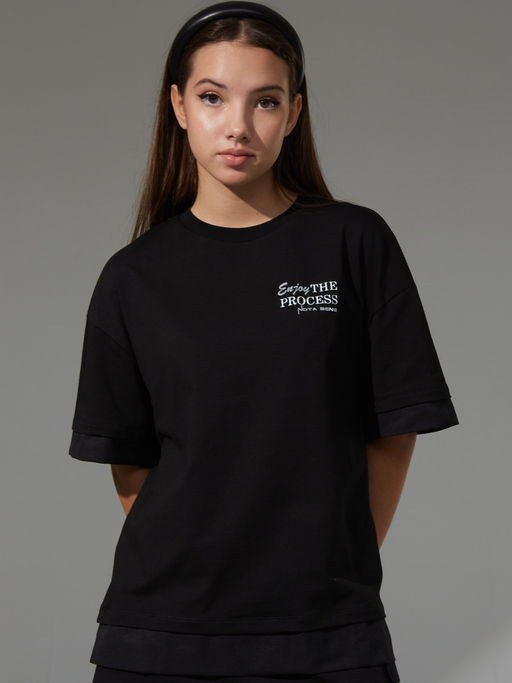 .   Коллекция школа 2024. Трикотажная Футболка из хлопковой кулирки с дабавлением эластана качества пенье пл.180 гр/м2. Футболка для девочки свободного силуэта оверсайз для повседневной носки со спущенным плечом, с втачным коротким рукавом, Эффект "обманки"-двойная футболка с рукавом и низом изделия обманкой из текстиля, низ футболки с разрезами..Горловина округла,планка горловины из хлопковой рибаны. Декорировано принтом, перевод "наслаждайся процессом" Состав:92% хлопок, 8% лайкра