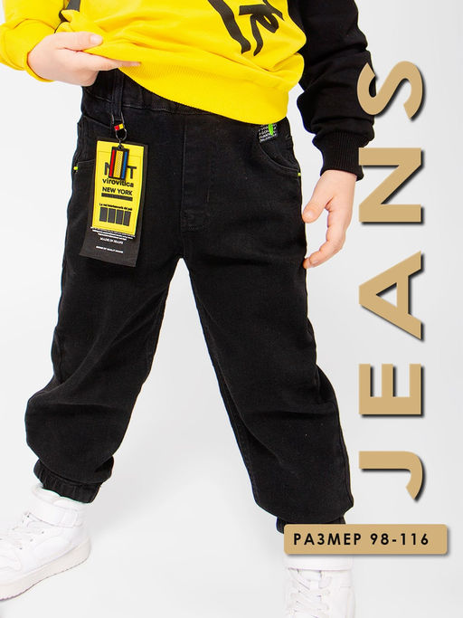 Джоггеры детские Rong Rong. Трендовая модель из эластичного денима, на широкой резинке, без молнии и пуговиц, пояс дополнен брелком. Брючины свободные в районе бедер и зауженные к низу, с манжетами.