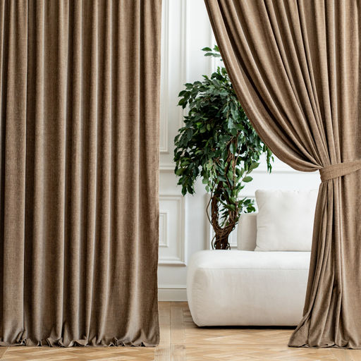 Прямые портьеры из фактурной ткани шенилл на универсальной шторной ленте. Модель дополнена декоративными подхватами. Состав - 100% полиэстер.
