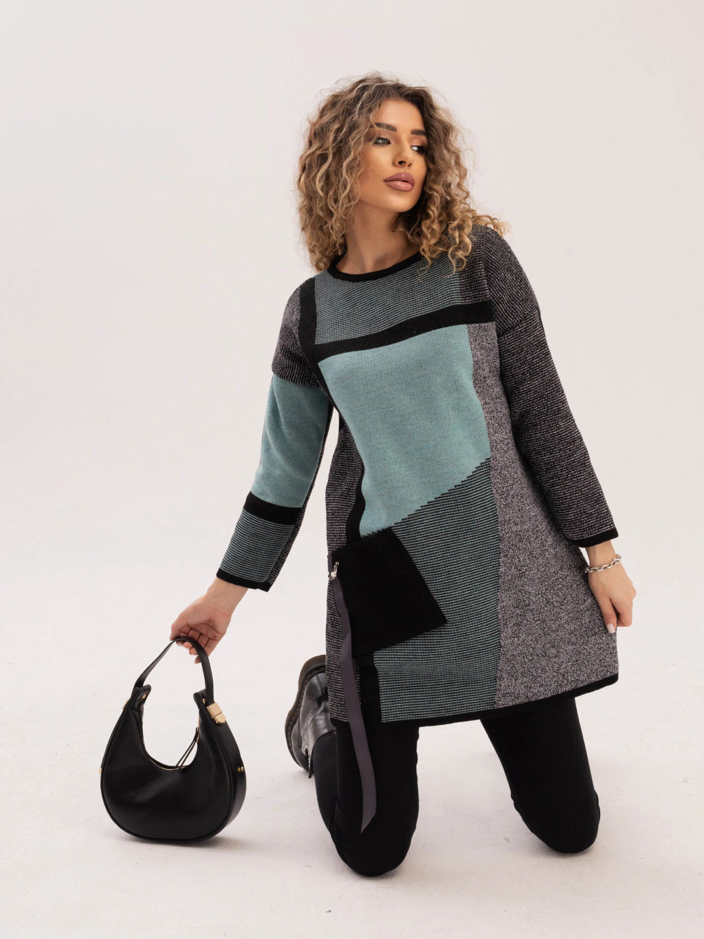 Удлиненный джемпер полуприлегающего силуэта с круглой горловиной, выполнен в оригинальном цветовом  решении. Рукав 3/4. Полочка, спинка и рукава выполнена в жаккардовом переплетении с контрастным геометрическим рисунком. Накладной карман с декоративной тесьмой.