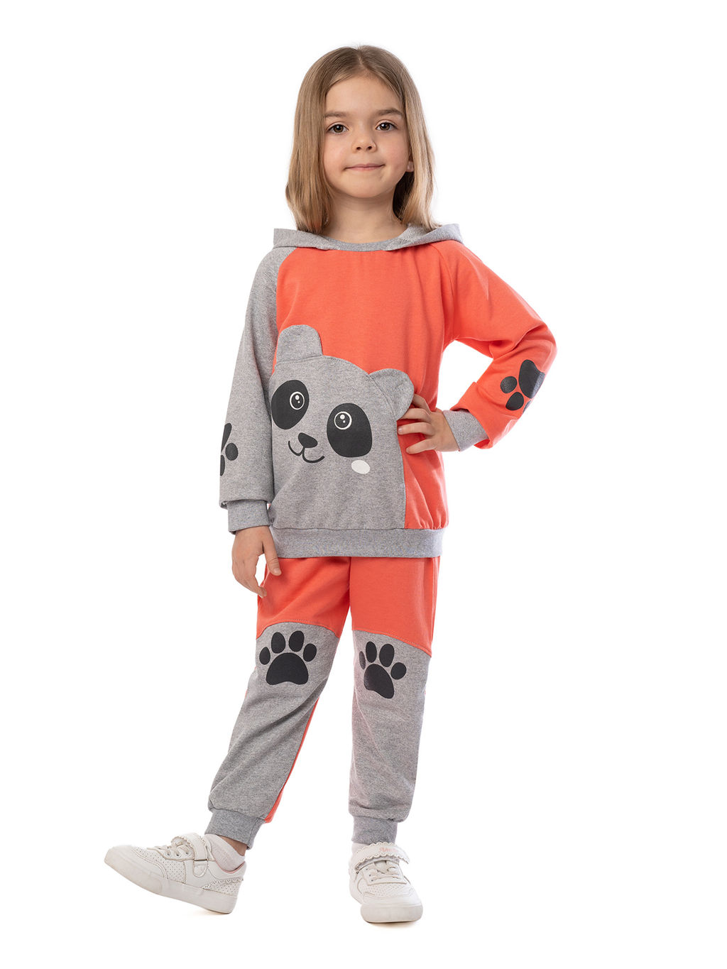 Износостойкий, приятный к телу, плотный трикотаж. Хорошо переносит частые стирки, стойкий к появлению катышков и потёртостей. Спортивный детский костюм кораллового цвета с серыми меланжевыми вставками Брюки на резинке в поясе, по бокам карманы. Толстовка с капюшоном, рукавами регланами. Низ толстовки, пояс брюк, манжеты на рукавах и на штанинах из мягкого трикотажа. Спереди аппликация панда.