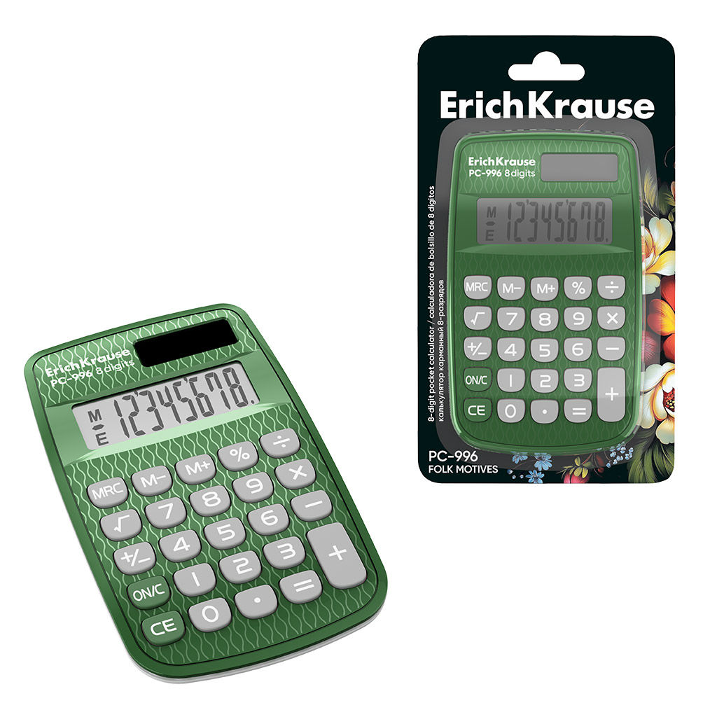 • АКЦИЯ Цена за 1 шт. Калькулятор карманный 8-разрядов ErichKrause PC-996 Folk Motives, зеленый (в блистере по 1 шт.)
