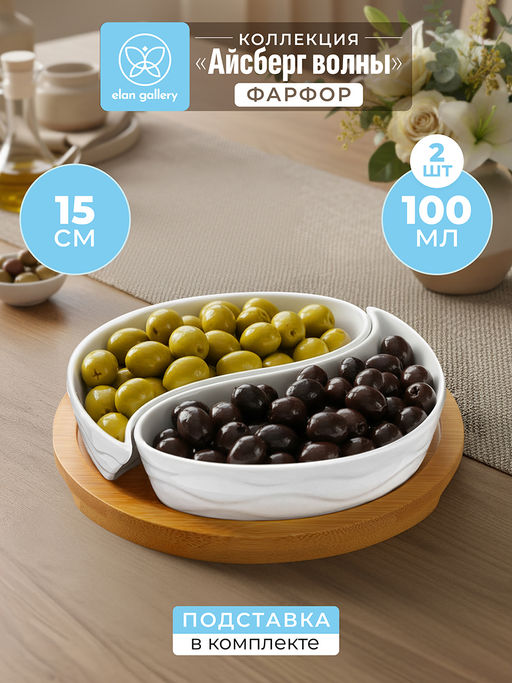 Тарелка под оливки Инь-Янь из серии Айсберг волны от Elan Gallery подойдёт для эстетичной сервировки вашего стола. Общий размер изделия 15х15х3,5 см. Размер каждой секции 14х9х2,5 см, объём 100 мл. Выполнены из высококачественного белого фарфора. Он не впитывает цвет продуктов и легко отмывается, благодаря чему надолго сохраняет свою белизну. Поверхность изделий украшают рельефные узоры в виде поперечных волн. Подставка выполнена из натурального бамбука. Размер 15х15х1 см. Менажница поможет красиво подавать маслины, орехи или сыры. Она станет незаменимым элементом праздничных обедов или неторопливых завтраков. Послужит в качестве конфетницы, позволив угостить себя и гостей любимыми сладостями: конфетам, мармеладом, леденцами и безе. Не рекомендуется применять абразивные моющие средства. Без бамбуковой подставки подходит для использования в посудомоечной машине и микроволновой печи. Бамбук нельзя замачивать! Поставляется в дизайнерской картонной коробке благодаря ей вам не потребуется дополнительная подарочная упаковка. Фарфоровая сервировочная посуда будет оригинальным подарком для хозяйки, ценящей не только практичность, но и привлекательность. Серия Айсберг волны от бренда Элан Галерея станет украшением любого кухонного инвентаря и позволит собрать красивый сервиз в едином стиле!