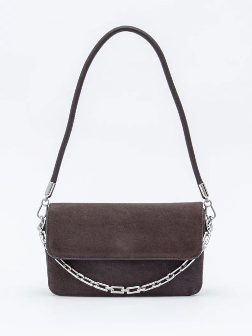 Сумка-багет, выполнена из замши. Декорирована цепочкой. Дополнена серебристой фурнитурой. Данная модель закрывается на клапан. Каркас полужесткий. Носится на плече за съемную ручку или через плечо. В комплекте имеется съемный ремень с регулировкой длины.