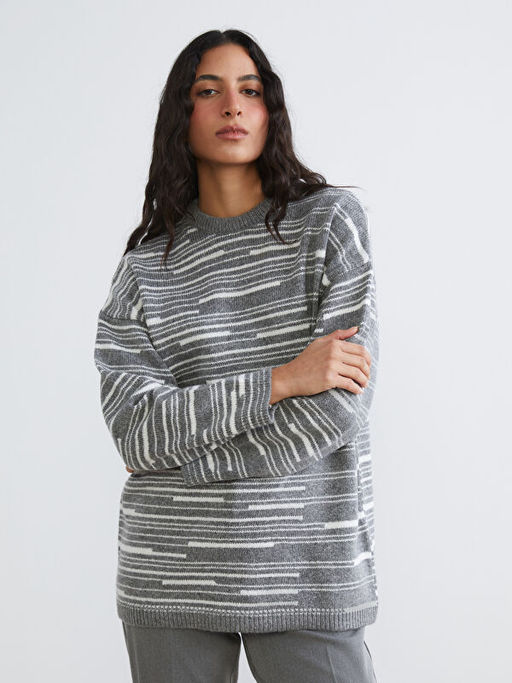 Bisiklet Yaka ?izgili Oversize Kad?n Triko Kazak