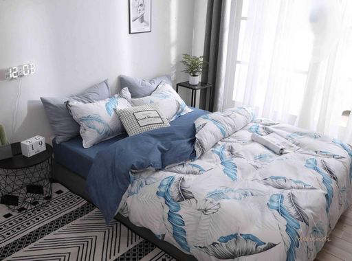 1.5 спальный: пододеяльник 150х220 см, простыня 90х200+20 см резинка по кругу // 150х220 см резинка по углам, наволочка 70х70 см - 2 шт.