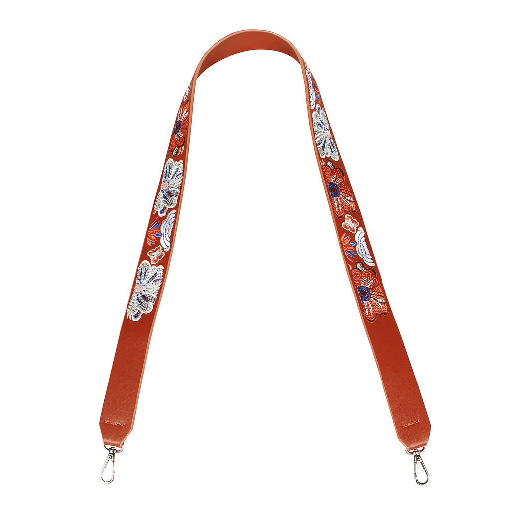 Коричневая ручка для сумки с серебристыми карабинами длиной 110см и шириной 4.5см изготовлена из искусственной кожи. Длинный ремень украшен крупными, разноцветными, вышитыми гладью цветами. Дополнив любую сумку или клатч таким аксессуаром можно получить яркий акцент вашего образа, а также удобное ношение через плечо.