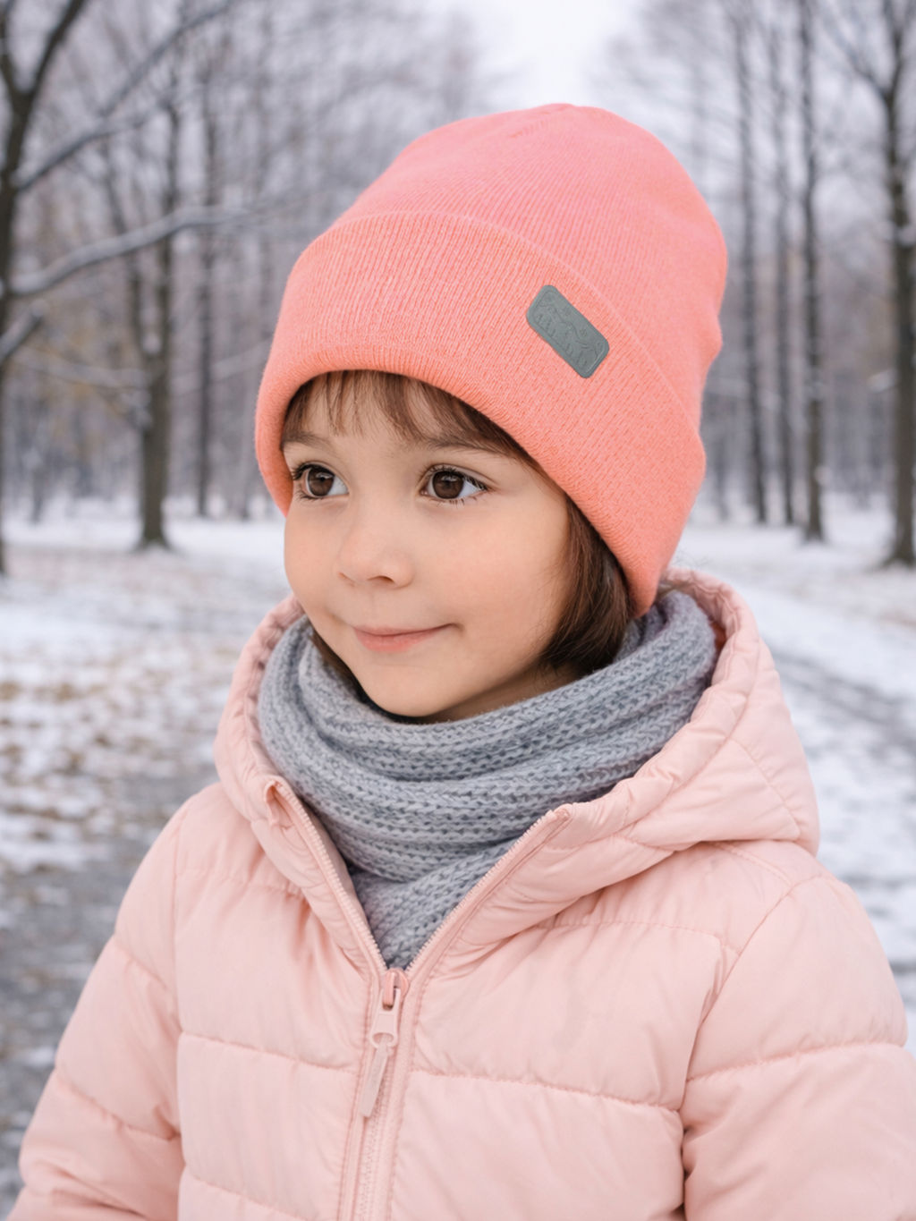 Демисезонная однотонная двухслойная шапка для мальчиков и девочек. Верхний слой из акриловой износостойкой и мягкой пряжи с добавлением мериноса (30%). Внутренний слой из хлопковой пряжи белого цвета. Небольшой отворот. Спереди небольшая светоотражающая нашивка, чтобы ребенок был заметен в темное время суток.