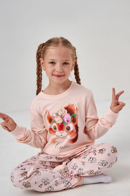 Пижама для девочки подростка со штанами и кофтой из трикотажа будет идеальным выбором для дома и детского сада. Резинка не вшита, поэтому ее можно убавить. Манжеты на пижаме смогут отрегулировать длину кофты и брюк.