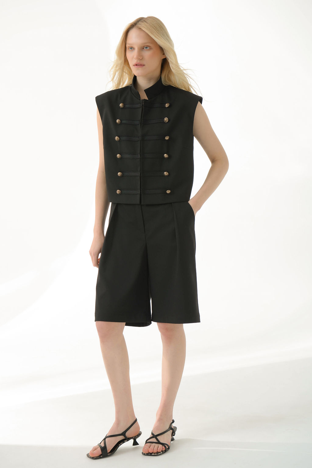 Укороченный жилет в стиле милитари придает структуру и уверенность.Выполнен из плотной костюмной ткани, хорошо держит форму,комфортная подкладка из поливискозы. Украшен декоративной тесьмой и дополнен матовыми мелалическими пуговицами. Воротник-стойка,застежка на крючки.Жилет можно носить как первый слой или поверх водолазки, топа, рубашки.Идеально сочетается с шортами и брюками из нашей коллекции.