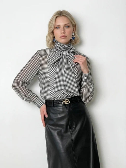 Блузка из легкой органзы в клетку прямого силуэта. Классический рубашечный воротник на стойке с планкой. Рукав втачной, длинный, на манжете. На полочке предусмотрены рельефы. В качестве декоративных элементов выступают съемная роза-брошь и съемная завязка-бант, выполненные из основной ткани. Застежка на петли и пуговицы. Рост модели на фото 170 см, на ней изделие 42 размера. Длина изделия по спинке составляет 63 см. Рекомендуется деликатная стирка при 30 градусах.­