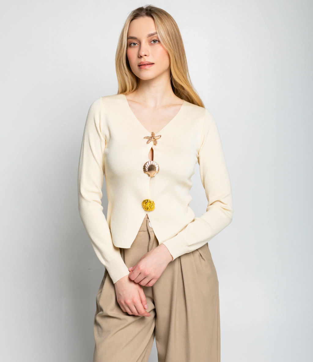 Кардиган это одежда, которая подчёркивает женственность любой женщины. Модель отлично подойдёт для вашего ассортимента и будет востребована в розничных магазинах. Его выбирают оптовые покупатели, которые ценят сочетание высокого качества и разумной цены. Фасон кардигана облегающий, длина до талии. Изделие выполнено из гладкой трикотажной ткани, имеет длинные рукава и V?образный вырез горловины. Главной особенностью являются крупные декоративные пуговицы необычной формы, стилизованные под морские мотивы (звезда, ракушка и др.), расположенные по центру изделия. Нижний край оформлен небольшими уступами, создающими интересный силуэт; модель отлично подходит для создания ярких и эффектных образов. Для пошива использована ткань в составе 65% хлопок, 30% полиэстер, 5% эластан. Материал отличается комфортом при носке, хорошей воздухопроницаемостью и эластичностью, сохраняет форму и внешний вид даже после многократных стирок, что делает изделие практичным и долговечным. Цвета насыщенные и полностью соответствуют фотографиям на сайте. На странице размещена таблица размеров:, воспользовавшись ею, вы сможете самостоятельно снять мерки и убедиться в правильности выбора. Установленная оптовая цена выгодна; для оптовых клиентов действует гибкая система скидок и индивидуальные условия сотрудничества. Уточнить минимальный заказ и сроки поставки можно у менеджера. -- Характеристики -- Цвет: светло-бежевый Пол: Женский Страна производитель: Китай Сезон: Демисезон Материал: Хлопок, Эластан, Полиэстер