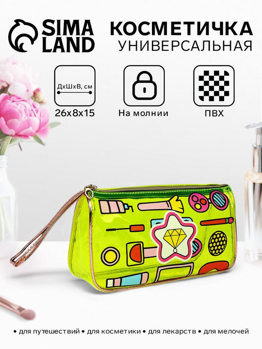 Для кого: Для девочки. Для кого: Для женщины. Длина, см: 26. Ширина, см: 8. Высота, см: 15. Количество отделений: 1. Вид застёжки: Молния. Тематика: Женская. Рисунок: Да. Размер: Большой. Особенности косметичек: Для бассейна. Особенности косметичек: С рисунком. Бесплатная доставка: Да. Размеры товара: 8/15/26. Примечание: Оттенок данного товара может незначительно отличаться от фото/видеоизображения (в зависимости от настроек яркости вашего экрана).. Примечание: При отрицательной температуре материал становится хрупким. Поэтому перед использованием дайте товару согреться до комнатной температуры..