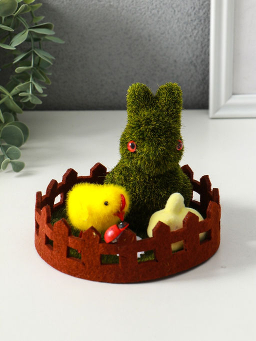 Эта пасхальная фигурка с зайчиком создаёт тёплую весеннюю атмосферу в вашем доме. Композиция из уютного фетра и лёгкого пенопласта изображает трогательную сцену: кролик на лужайке в окружении цыплят. Она станет сердцем праздничного декора, напоминая о пробуждении природы и семейном уюте. Универсальное оформление позволяет украсить интерьер не только на Пасху, но и в любое время года, даря ощущение доброй сказки. Детали и преимущества * Материалы: мягкий фетр и формованный пенопласт для детальной проработки. * Размер: компактная композиция 12.5x12.5x10.5 см легко впишется на полку или праздничный стол. * Дизайн: яркая многоцветная палитра и проработанные элементы заборчик, травка, фигурки животных. * Назначение: готовое пасхальное украшение, не требующее сборки. * Безопасность: лёгкие и прочные материалы, безопасные для домашнего использования. Создайте праздничное настроение Фигурка передаёт радость и беззаботность весеннего праздника. Её можно использовать как самостоятельный декор или как центральный элемент пасхальной композиции в корзинке с яйцами. Трогательный зайчик с цыплятами символ заботы и новой жизни, который понравится и детям, и взрослым, становясь милой традицией вашей семьи.