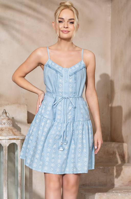 Короткий сарафан Mia-Amore, на тонких бретелях, с центральной застежкой на пуговицы и оборкой по низу. Изделие выполнено из двух видов хлопка: однотонного и принтованного, имитирующего вышивку. В качестве отделки используется тесьма с бахромой и контрастный кант в цвет принта. На полочках обработаны накладные карманы. Линию талии можно подчеркнуть за счет узкого пояса с пикантными кисточками на концах, который идет в комплекте.
