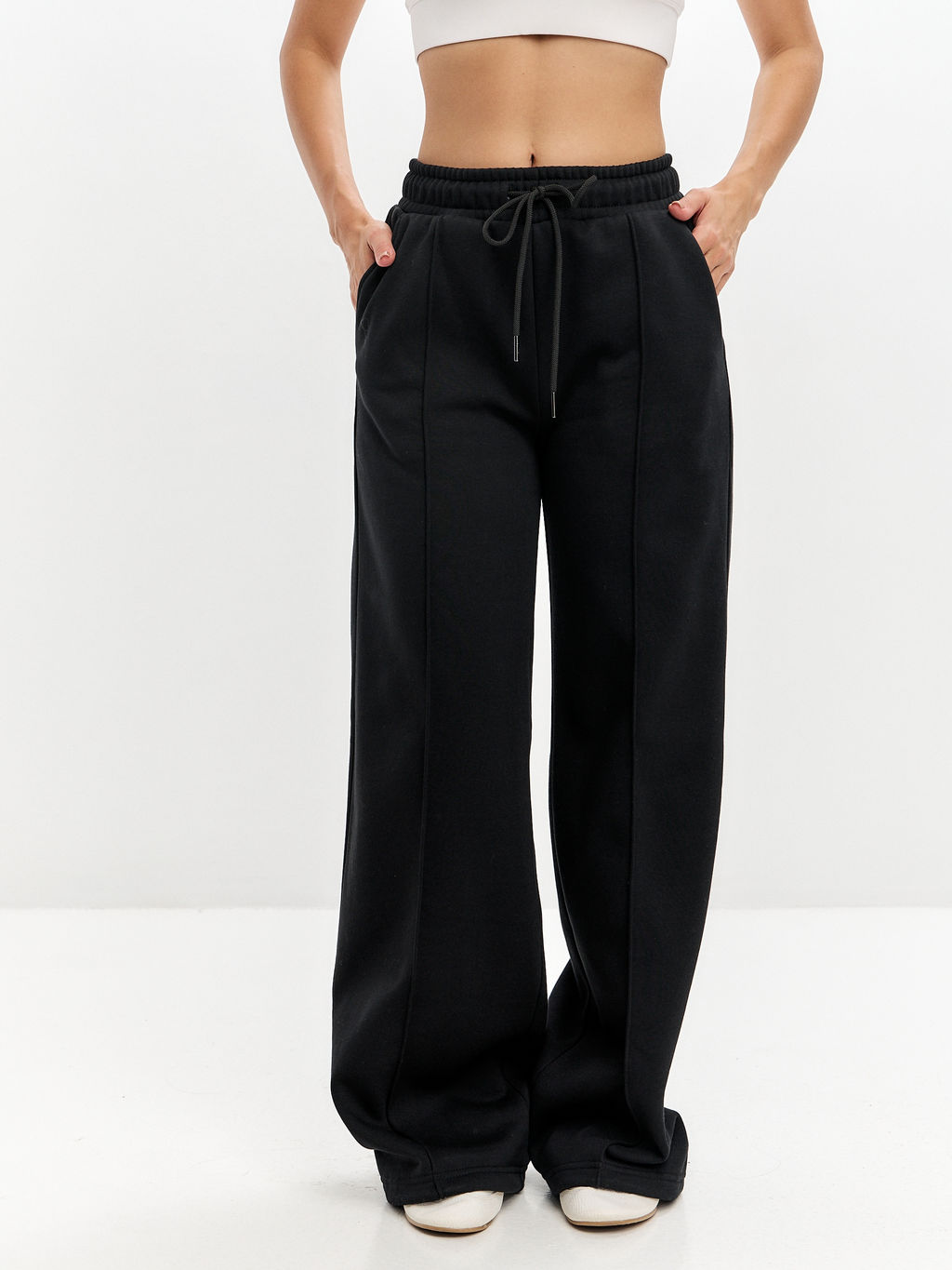 Женские артикул 22L-RR-1872 черного цвета брюки палаццо изготовлены из хлопкового трикотажного полотна с изнаночным начесом. Широкие брючины можно трансформировать, собрав низ на эластичный шнур с помощью фиксатора. Удобные наклонные карманы выполнены в боковых подрезах. Пояс брюк широкий, по линии талии собран на эластичную резинку, длина пояса дополнительно регулируется шнуром.