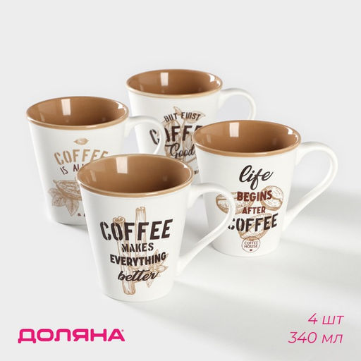Набор кружек Доляна «Вкусный кофе» изготовлен из качественного костяного фарфора и украшен красивым рисунком. Фарфоровые изделия обладают прочностью, выдерживают перепады температур. Кружки рассчитаны на ежедневное использование.Изделия отличаются высоким качеством исполнения и при бережном использовании прослужат долгие годы.Можно мыть в ПММ и использовать в СВЧ. Набор: Да. В наборе, шт.: 4. Количество персон: 4. Объём, мл: 340. Тематика: Надписи, цифры, буквы. Рисунок: Да. Дополнительный аксессуар: Без аксессуаров. Индивидуальная упаковка: Да. Можно мыть в посудомоечной машине: Да. Можно использовать в СВЧ-печи: Да. Текстура: Гладкая. Особенности: Без особенностей. Матовая поверхность: Нет. Бесплатная доставка: Да. Размеры товара: 9.2/10.2/13. Примечание: Оттенок данного товара может незначительно отличаться от фото/видеоизображения (в зависимости от настроек яркости вашего экрана).. Примечание: В наименовании указан полный объём с замером до края.Полезный объём будет отличаться в меньшую сторону от указанного..