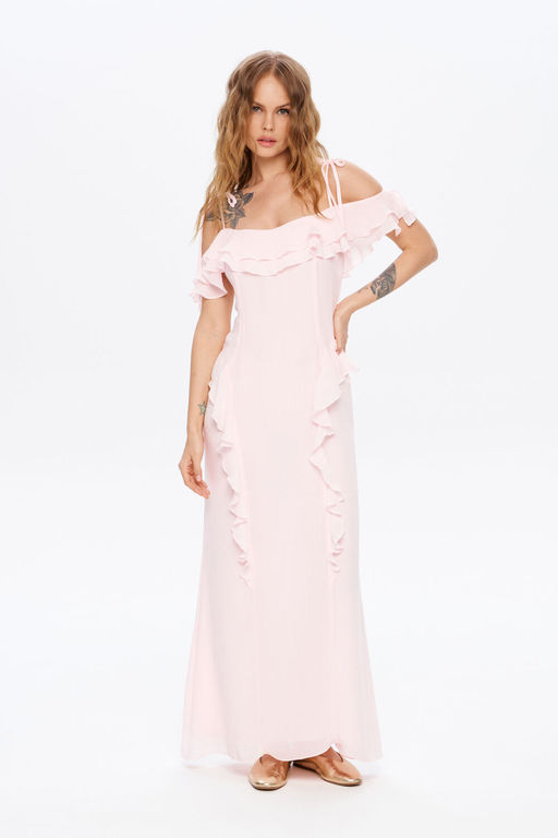 Детали: прилегающий силуэт, рельефные швы переда и спинки, фигурный лиф с оборками, застежка по спинке на потайную молнию, регулируемые бретели, платье на подкладке из основной ткани.