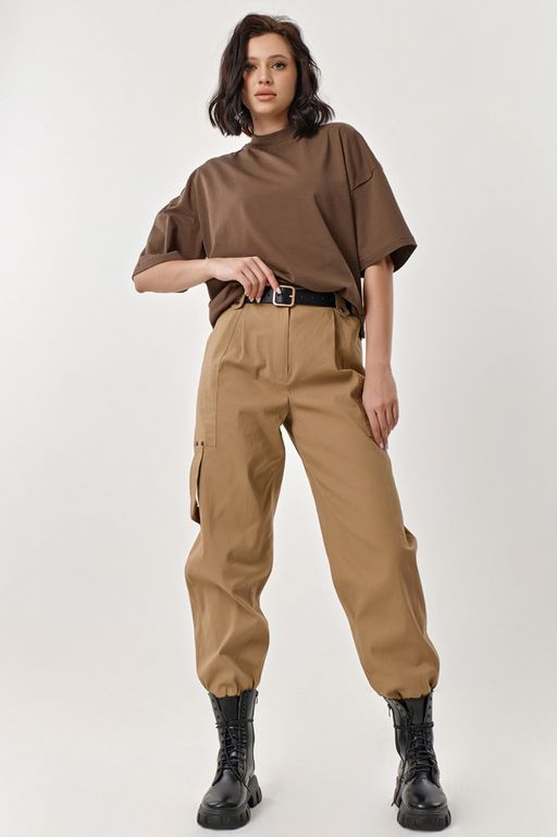 Особенности: Брюки "карго" прямого силуэта из хлопковой ткани. Детали: притачной пояс с застежкой на пуговицу, фигурные широкие шлевки, накладные боковые карманы, защипы по переду, кокетка по спинке, декоративный хлястик от низа кармана, по низу притачные манжеты со сборкой на резину. Застежка на гульфик с молнией.
