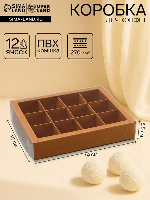 Коробка для 12 конфет, крафт с прозрачной крышкой, 19×15×3.5 см