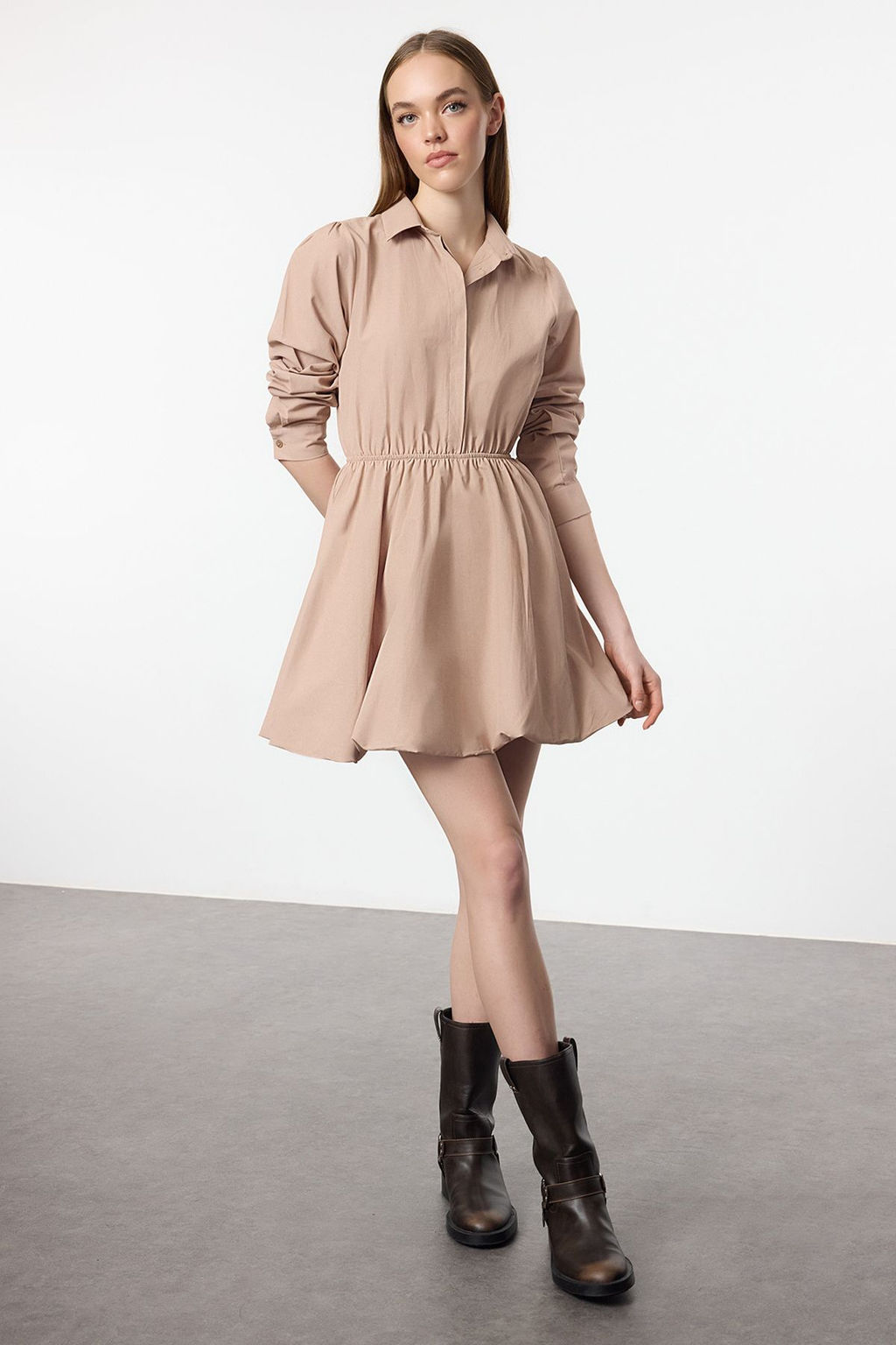 • Camel Balon Etek Gomlek Yaka Mini Dokuma Elbise TWOAW25EL00489