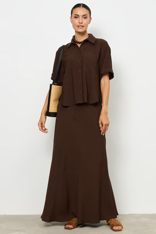 Юбка из вискозной ткани с крэш-эффектом, расширенная книзу. Крой юбки-по косой. Пояс с эластичной резинкой и кулиской.