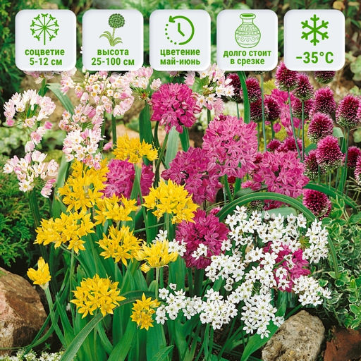 Описание товара Лук декоративный смесь (10 шт) это готовый способ добавить в сад динамику, объём и живую игру красок без сложного подбора растений. Главная особенность этой смеси непредсказуемая, но всегда гармоничная палитра: фиолетовые, синие, розовые, белые и жёлтые соцветия распускаются в разное время и на разной высоте, создавая эффект продуманной дизайнерской композиции.