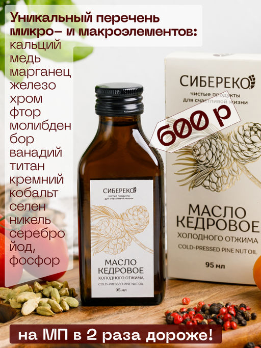 Описание товара Масло кедрового ореха Сибереко - натуральный продукт высшего качества. Мы делаем масло по технологии холодного отжима на капролоновом прессе, это гарантирует сохранение 100% витаминов и минеральных элементов.