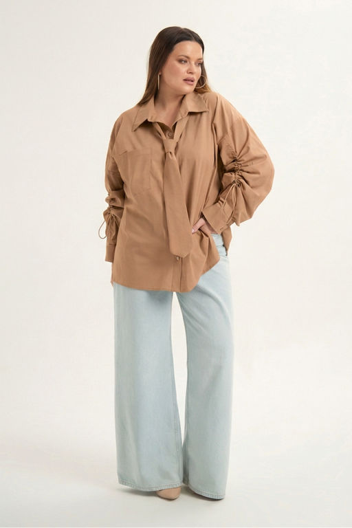 Блуза свободного покроя из хлопковой ткани .  Горловина оформлена воротником рубашечного типа. Застежка-планка с петлями и пуговицами. На спинке - кокетка с планкой и закрепками. Рукава - втачные со спущенной линией плеча, снизу -манжеты с застежкой на петли с пуговицами и кулисой по рукаву. По переду с одной стороны обработан накладной карман. В комплект входит съемный галстук.