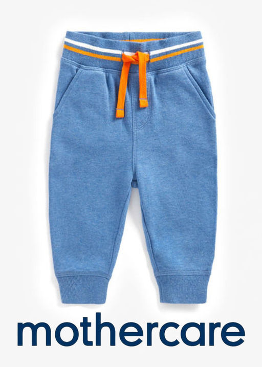 Спортивные брюки в голубом цвете для мальчика, выполненные из хлопкового материала и украшенные контрастными полосами.