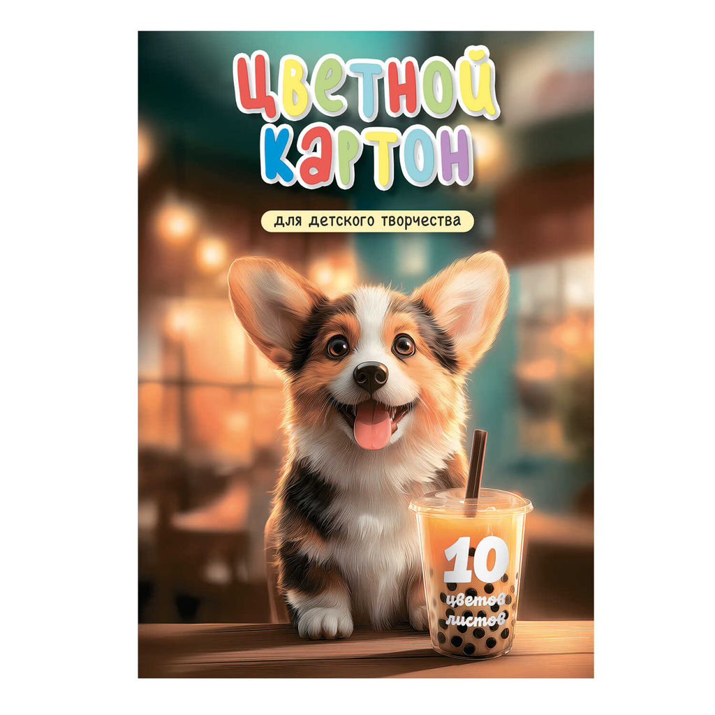 Цветной картон арт. 73190 КОРГИ С БАБЛ-ТИ /А4, папка с клапанами, 10 л, (8 цветов+золото+серебро), обложка - полноцветная печать, мелованный картон с серым оборотом 230 г/м?, блок - мелованный картон с серым оборотом, 200 г/м?, 10 цветов, односторонняя печать /