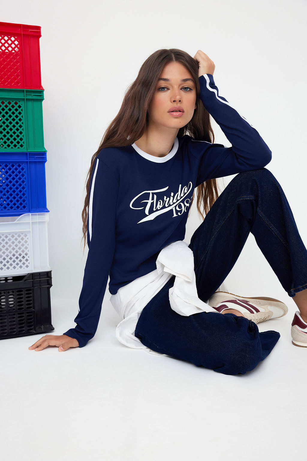 Lacivert Slogan Bask?l? Serit Detayl? Vucuda Oturan Bisiklet Yaka Esnek Orme T-Shirt TWOAW26TS00015
