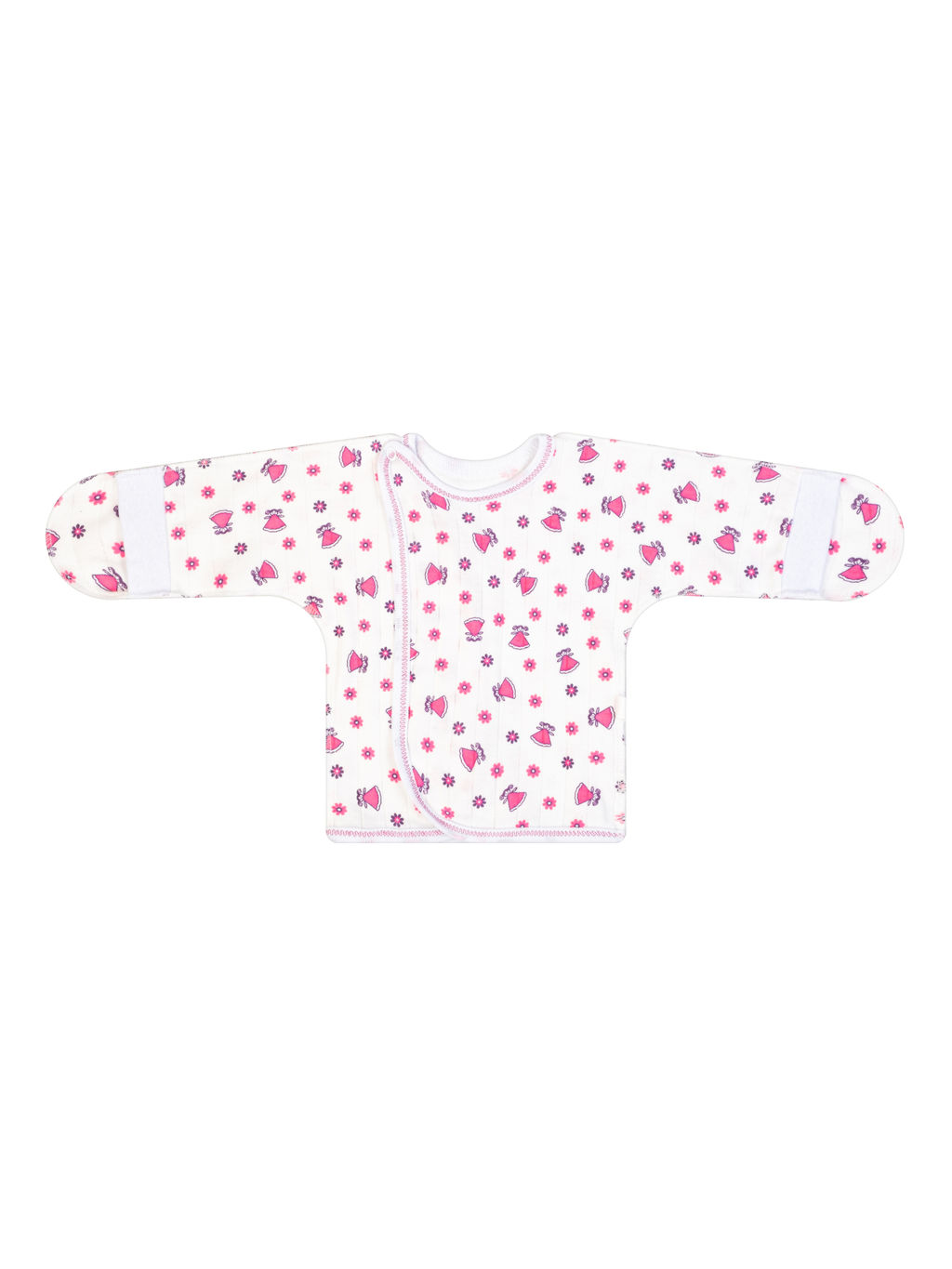 Ясельная кофточка-распашонка швами наружу с манжетиками на рукавах и клапаном для закрытия ручек. Можно делать открытое и закрытое положение рук для малыша. Края обработаны трикотажной бейкой. Распашонка застегивается на запах на кнопочку на плече. Сшита из мягкого, гипоаллергенного, дышащего хлопкового трикотажа белого цвета с рисунком малиновые куклы.