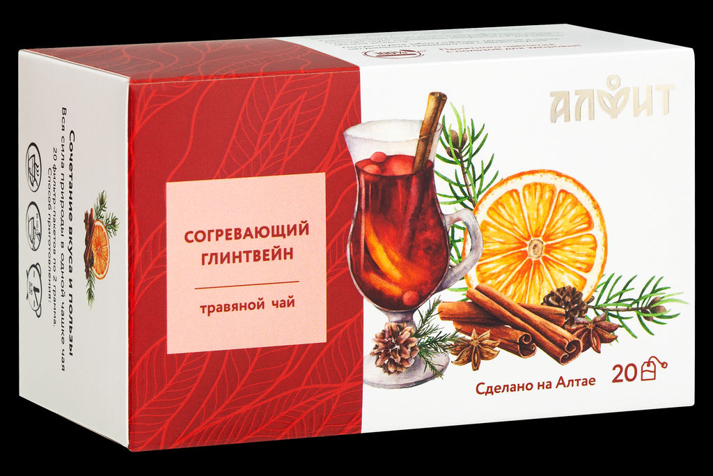 Яркий согревающий напиток с характерным вкусом глинтвейна с пряностями, имбирем и апельсином дополнен гибискусом и куркумой.