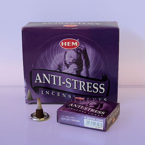 Благовония конусы АНТИСТРЕСС торговой марки  HEM, Индия. Блок из 12 упаковок по 10 конусов; Состав - древесная стружка, композиционная натуральная масляная ароматическая эссенция. Размеры блока 15Х12,5Х6,5 см; высота конуса 3-3.5 см, размеры пачки конусных благовоний: 7Х6Х2см