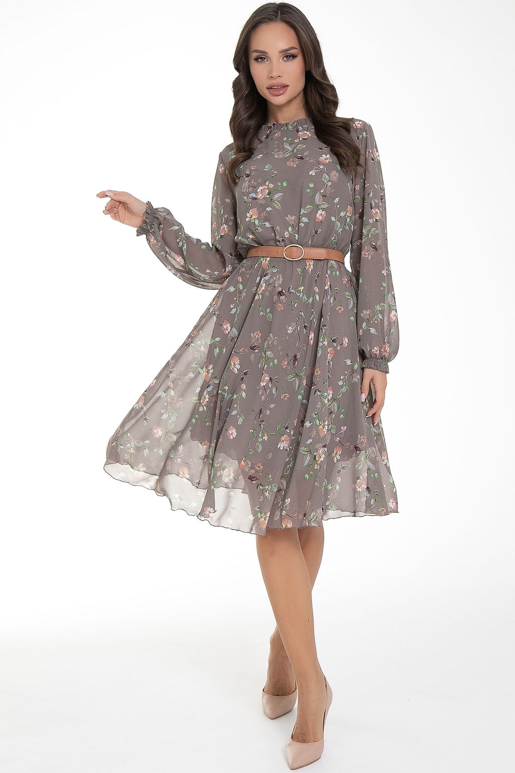 Восхищайте и удивляйте! Элегантное  шифоновое платье, подчеркивающее женственность - отличное решение на каждый день или на праздник для современной стильной женщины. Шикарная модель с пышными красивыми рукавами выполнена из высококачественного шифона с авторским цветочным принтом. Очаровательное свободное платье с юбкой полу-солнце создаст нежный воздушный образ! Круглая горловина оформлена рюшей с застежкой на пуговицу на спине. Платье имеет идеальную посадку благодаря индивидуальной корректировки длины за счет мягкой комфортной резинки на талии. По переду сделаны вытачки на грудь. Платье отрезное по талии. Рукава втачные длинные, снизу подогнуты и сосборены на резинку. Платье с подкладом, притачным по горловине и пройме. Без ремня, ремень как пример образа.