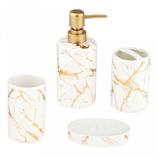 Набор для ванной "Мрамор" 4 предмета: дозатор для мыла 360мл, д7см, h17,8см; мыльница 11,3х7,8х2,4см; стакан для зубных щеток с разделителем 330мл, д7см, h10,7см, стакан 290мл, д6,3см, h11см; фурнитура пластик "под золото", глянцвая глазурь, белый/зо
