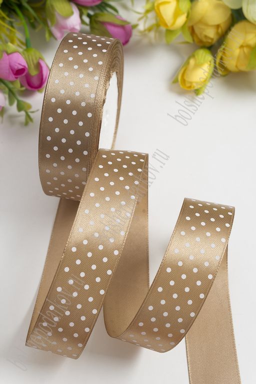 Лента атласная в горошек 2,5 см*25 ярд (SF-1782) бежево-коричневый №060