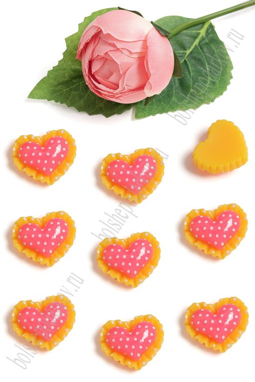 Кабошон "Сердечко в горошек" (50 шт) SF-5729, желтый/ярко-розовый