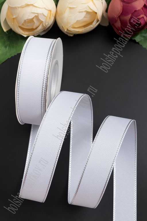 Лента репсовая с люрексом 2,5 см*20 ярд (SF-5828) белый/серебро №01