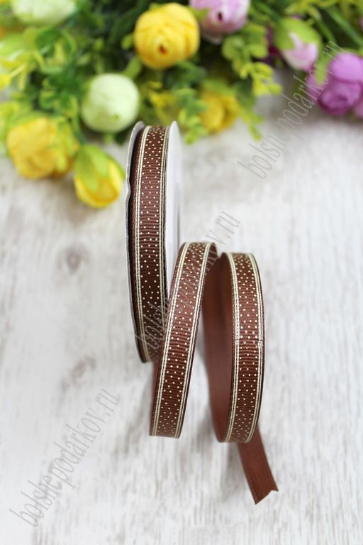 Лента репсовая 1 см*20 ярд "Горошек с полосками" SF-1294, темно-коричневый №32