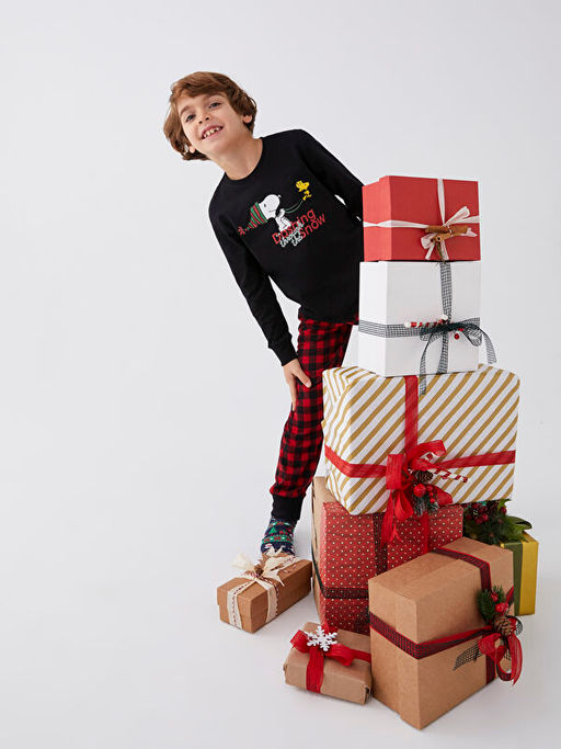 Bisiklet Yaka Snoopy Bask?l? Uzun Kollu Erkek ?ocuk Pijama Tak?m?