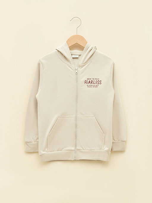 Kap??onlu Bask?l? Uzun Kollu Erkek ?ocuk Fermuarl? Sweatshirt